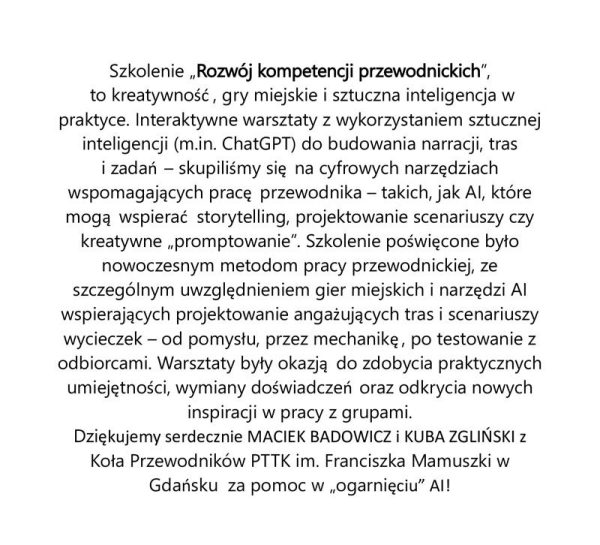 Szkolenie „Rozwój kompetencji przewodnickich”, to kreatywność, gry miejskie i sztuczna inteligencja w praktyce.