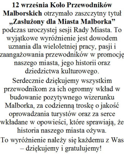 „Zasłużony dla Miasta Malborka” 12 września Koło Przewodników Malborskich otrzymało zaszczytny tytuł „Zasłużony dla Miasta Malborka” „Zasłużony dla Miasta Malborka” 15 września 2025 1 min read